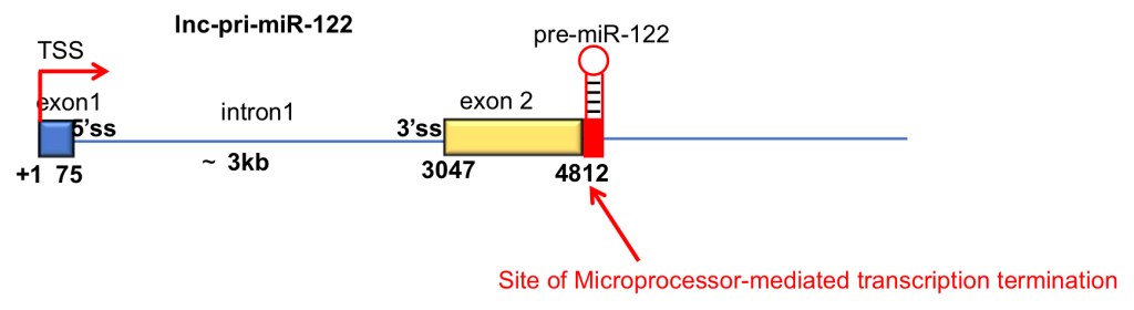 MicroRNAs are expressed as part of longer primary (pri)-miRNA transcripts, which are processed in the nucleus by the Microprocessor complex (Drosha+DGCR8) and then in the cytoplasm by Dicer to generate a mature miRNA. Pri-miR-122 is a long noncoding (lnc)RNA. In collaboration with Nick Proudfoot’s group in Oxford, we found that pri-miR-122 and other lnc-pri-miRNAs use an unusual mechanism of transcription termination which is mediated directly by Microprocessor cleavage, in contrast to the usual mechanism of cleavage and polyadenylation (Dhir et al, NSMB 2015).